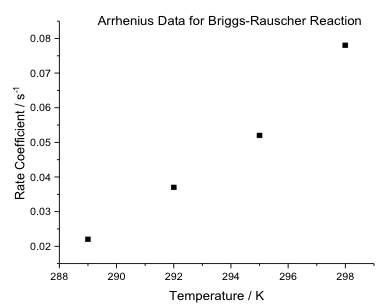 Example: The Arrhenius equation is defined as: k = A e-Ea/RT where k is the rate coefficient (s-1), A the pre-exponential factor (s-1), R the gas constant (8.314 Jmol-1K-1), Ea the activation energy (J mol-1) and T the temperature (K). In the Briggs-Rauscher reaction (obeying the Arrhenius equation), the (overall) rate coefficient for the reaction was monitored as a function of temperature: